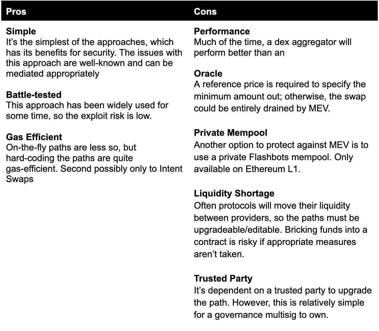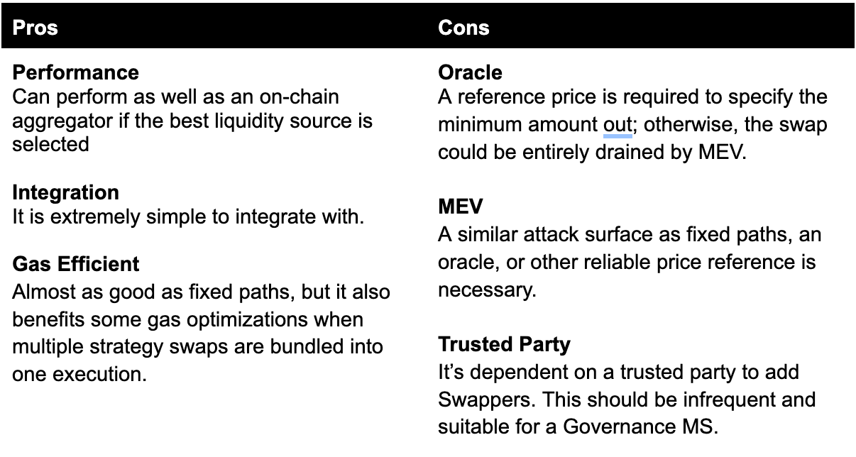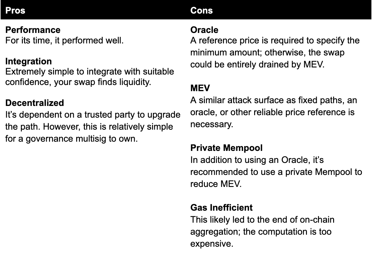 This approach is most suitable when there is an obvious source of liquidity for a swap, which is often the case for governance tokens; hence, fixed paths are often used for harvesting farming rewards.