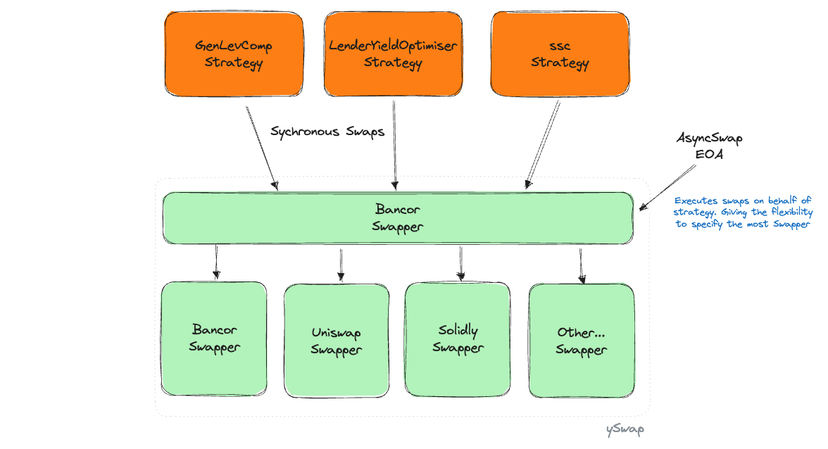 ySwap also introduces the concept of Synchronous and Asynchronous swaps. The synchronous swap will occur within the strategy transaction, most commonly a liquidation for withdrawal or a harvest that requires just-in-time (JIT) liquidity to report profits. However, many strategies do not need JIT liquidity; they can support a delay. In these circumstances, the Asynchronous swap can be used; this is where an external EOA triggers the swap and can specify the most suitable Swapper off-chain. The EOA is permission, but that account only has the flexibility to specify which pre-approved Swapper should be used for the Swap.