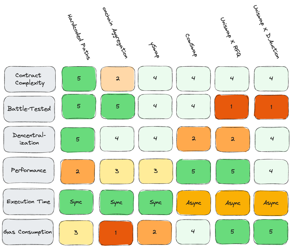 Below, we have an attempt to rate each of the on-chain swap options for various considerations: 1 is poor, and 5 is best-in-class. This is entirely our own judgment and should not be used to make architectural design or financial decisions.