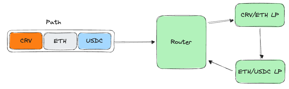 The fixed paths approach is the simplest of the options and also the most gas-efficient. The swap will always use the same router and the same path; there are no price optimizations, and it’s up to the devs to choose the most suitable path when deploying or upgrading the contract. The contract developers simply hard-code the swap path for each required swap.
