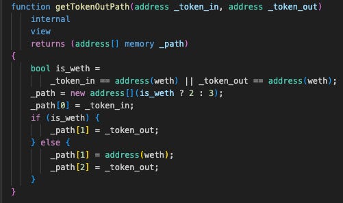 This simple algorithm checks if either of the tokens is ETH; if so, there will likely be a pool between ETH and the other token, so it returns a path of length 2. If neither is ETH, it sandwiches ETH between the two tokens in the path, which is also likely to have suitable liquidity.