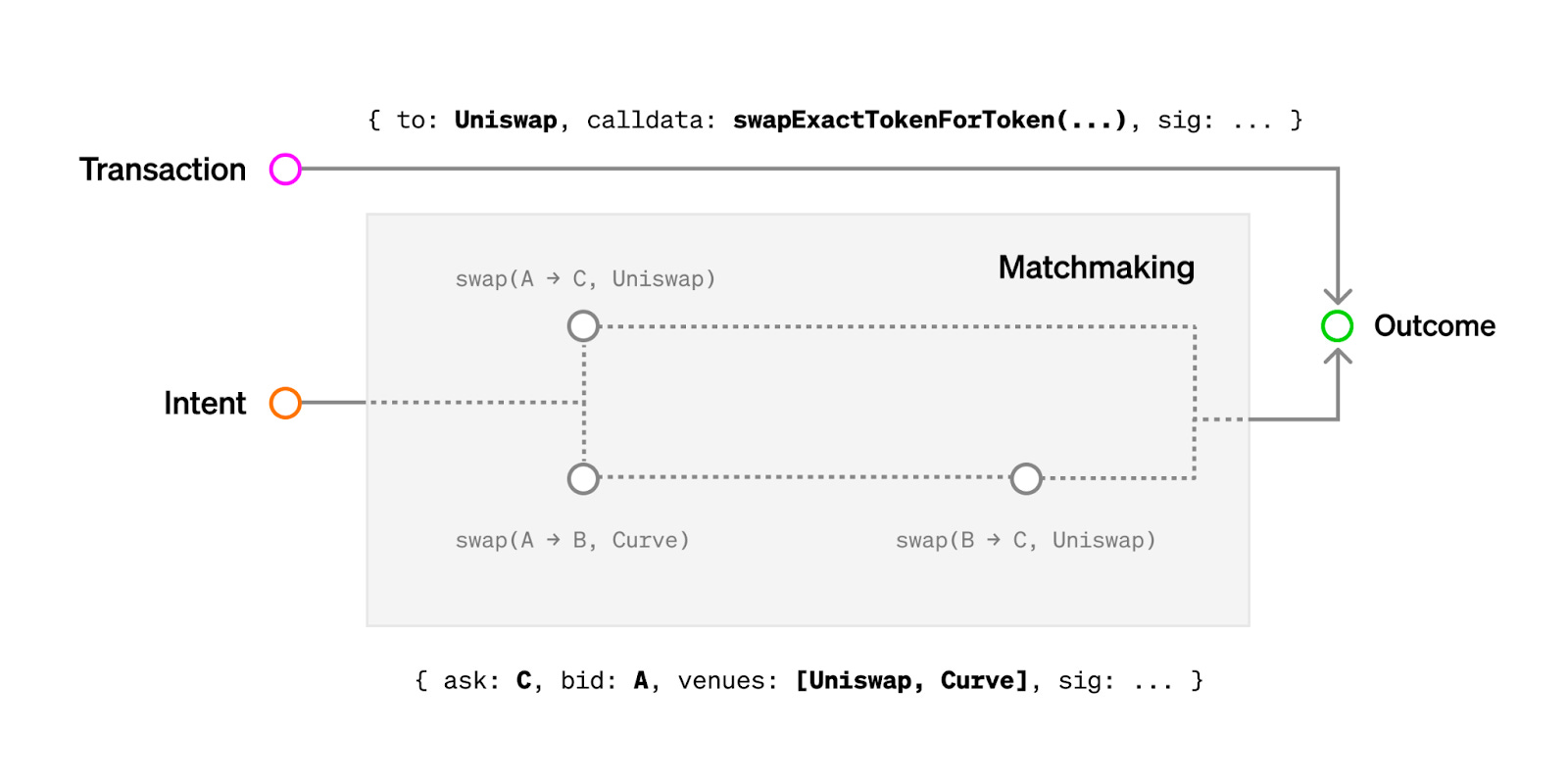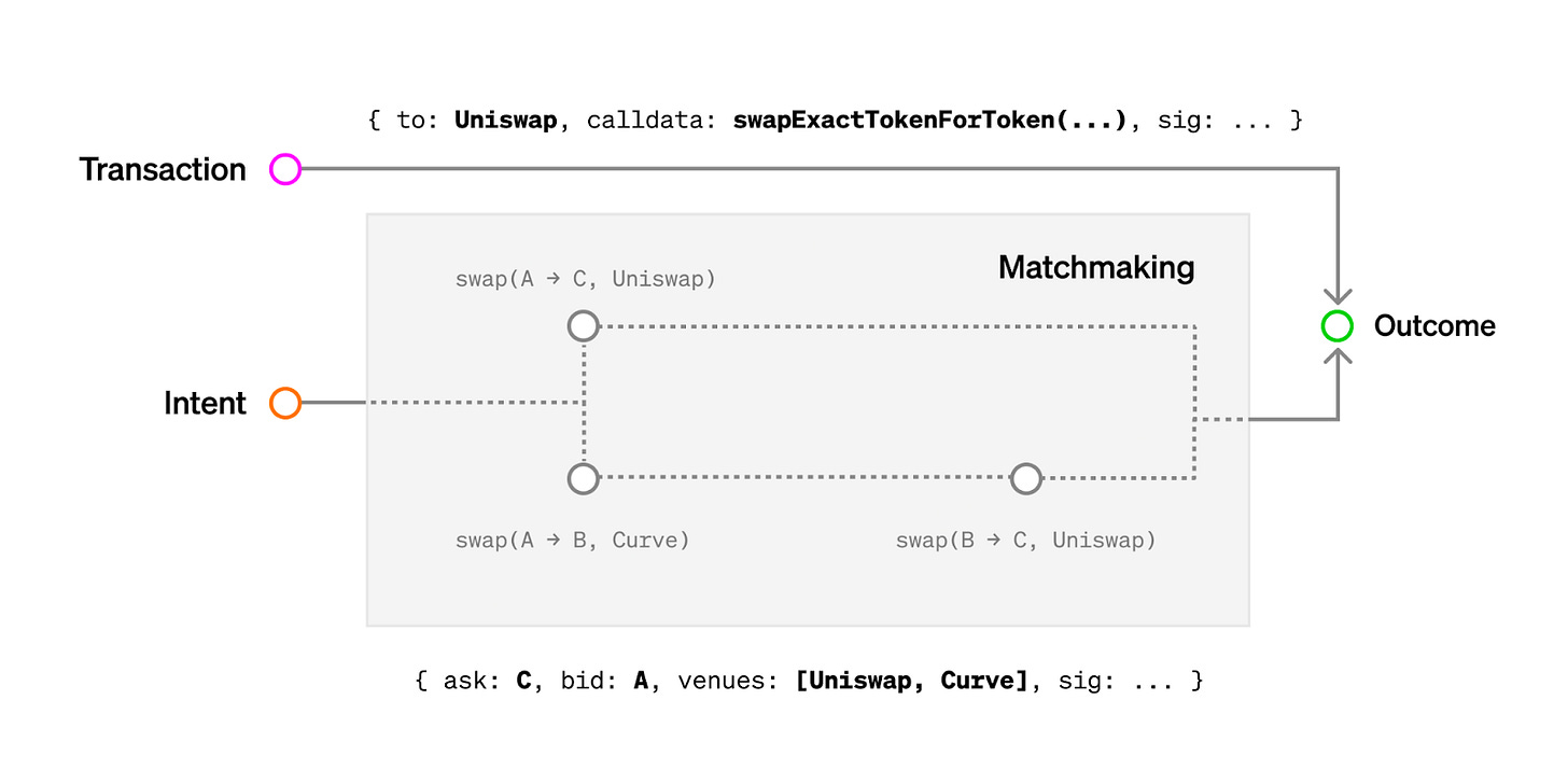 When submitting a transaction, users specify the exact computational path. When submitting an intent, users specify the goal and some constraints, and a matchmaking process decides the computational path to be taken. Source: Paradigm