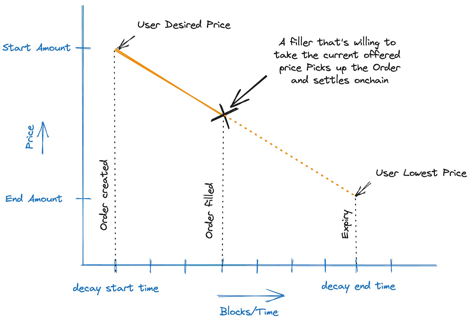 As time progresses and blocks roll in, the offer price of the order decreases. Once one of the fillers is willing to match the order, they construct and submit a transaction to fill the order.