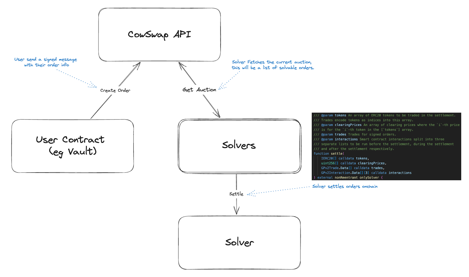 Users submit signed orders via CowSwaps API