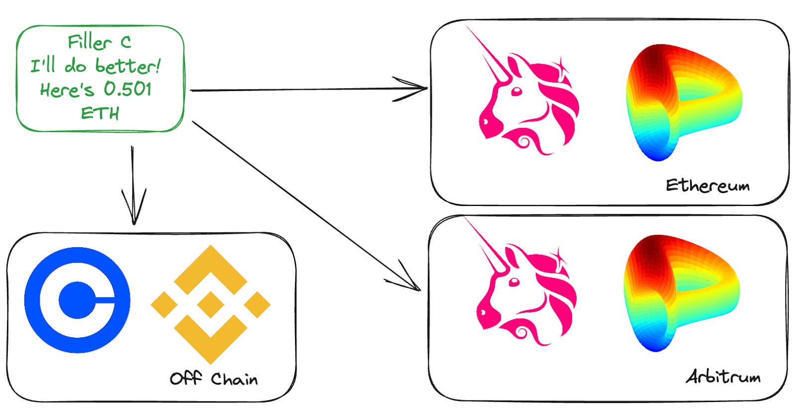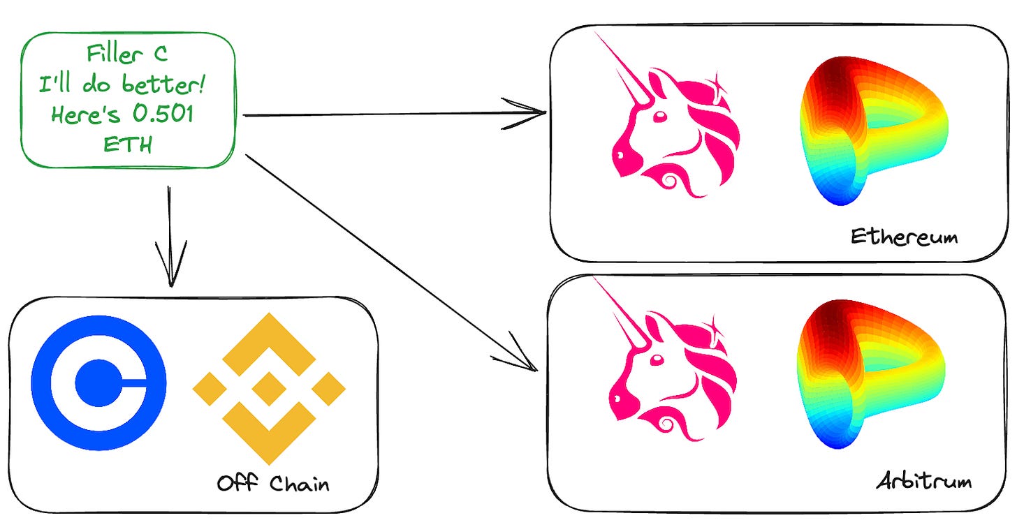 Fillers (AKA Solvers) complete the matchmaking process & complete the swap for the user. Where are fillers getting the liquidity? Well, that’s completely up to them. They could use on-chain liquidity sources in the same transaction, be it on one chain, multiple DEX actions, multiple chains, or even off-chain liquidity. The point is that the intent Swap platform doesn’t care; the user wants liquidity, and the fillers behave as market makers.