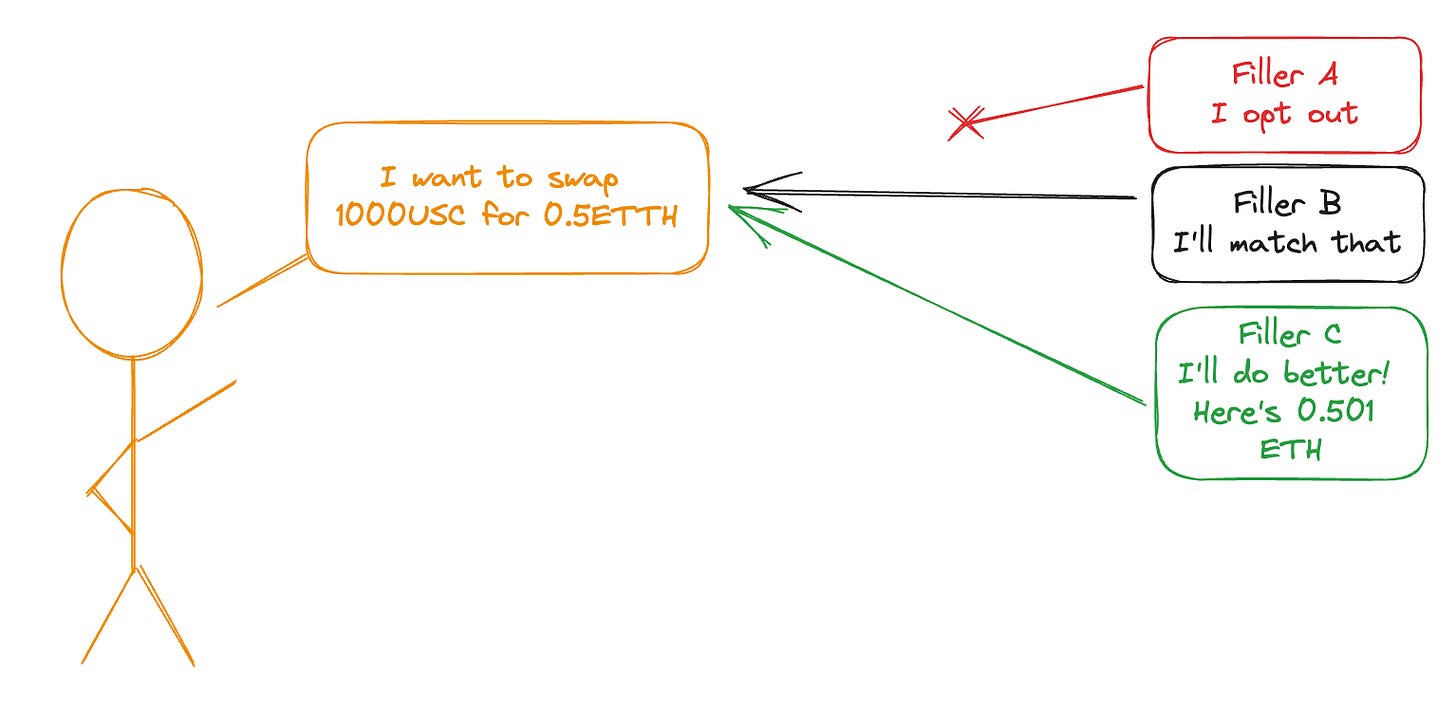 “In order to incentivize this network of fillers to offer their best possible price, UniswapX allows orders to specify a filler that receives the exclusive right to fill the order for a brief duration, after which the Dutch auction begins and any filler is able to execute the order.”