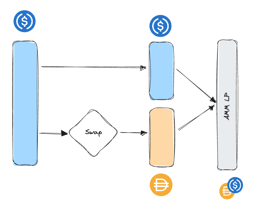 Vaults represent a typical application for on-chain swaps. For instance, when a vault deploys a single asset into a dual-asset liquidity pool (LP), a swap is needed to convert the deposited token into the LP's secondary token. The following image illustrates how this process would work in the case of a USDC vault deploying into a USDC/DAI liquidity pool.